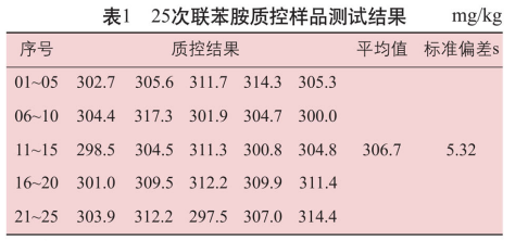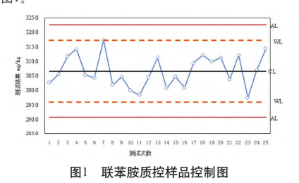 本文選擇禁用偶氮染料中的高頻檢出物聯(lián)苯胺為質控對象,采用有證標準物質作為質控樣品,利用25次獨立的質控數(shù)據(jù)繪制控制圖,并進行分析和應用。試驗結果表明,所測結果均在上、下警告限之內,證明檢測過程處丁受控狀態(tài),檢測結果可靠有效。