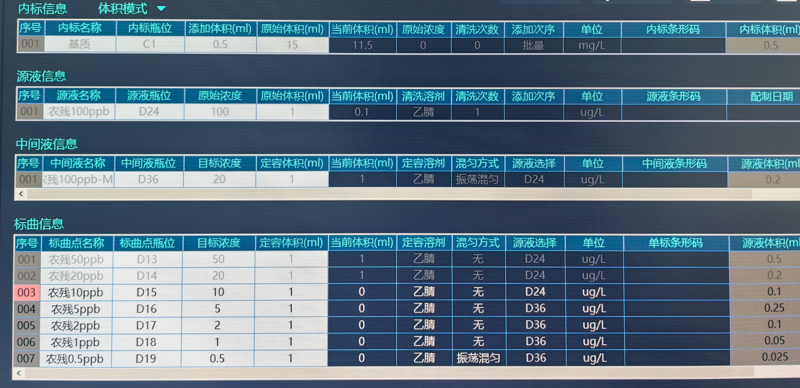 2.2 取100ppb農(nóng)殘混標(biāo),配置成0.5、1、2、5、10、20、50的農(nóng)殘標(biāo)曲,每個(gè)標(biāo)曲點(diǎn)同步添加0.5mL的基質(zhì)(裝在20ml試劑瓶中,放置于C1位);