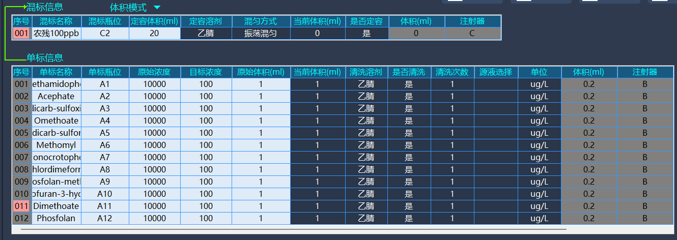 2.1.將數(shù)個(gè)農(nóng)殘單標(biāo)配置成100ppb的農(nóng)殘混標(biāo),進(jìn)行自動(dòng)混勻并轉(zhuǎn)移1mL到D24位