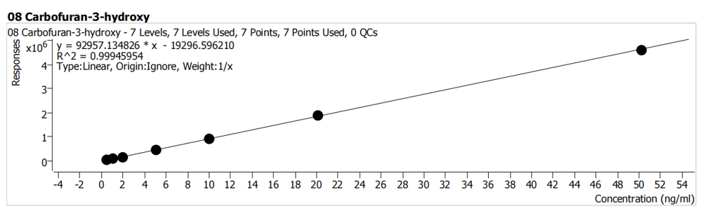 使用LC-MS/MS上機(jī)測(cè)定。上機(jī)結(jié)果標(biāo)曲曲線的線性R^2=0.999以上,與手工配置偏差<3%符合線性要求,測(cè)試結(jié)果如下圖所示。
