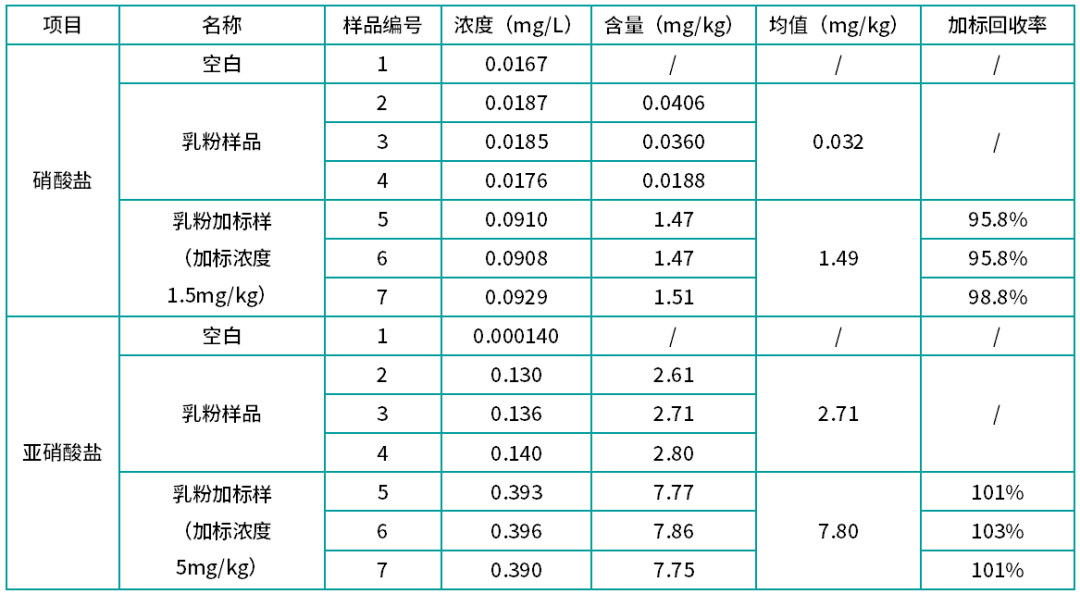 乳粉樣品中硝酸鹽加標回收率測試結果在95.8%~98.8%之間;亞硝酸鹽加標回收率測試結果在100.8%~103.1%之間。